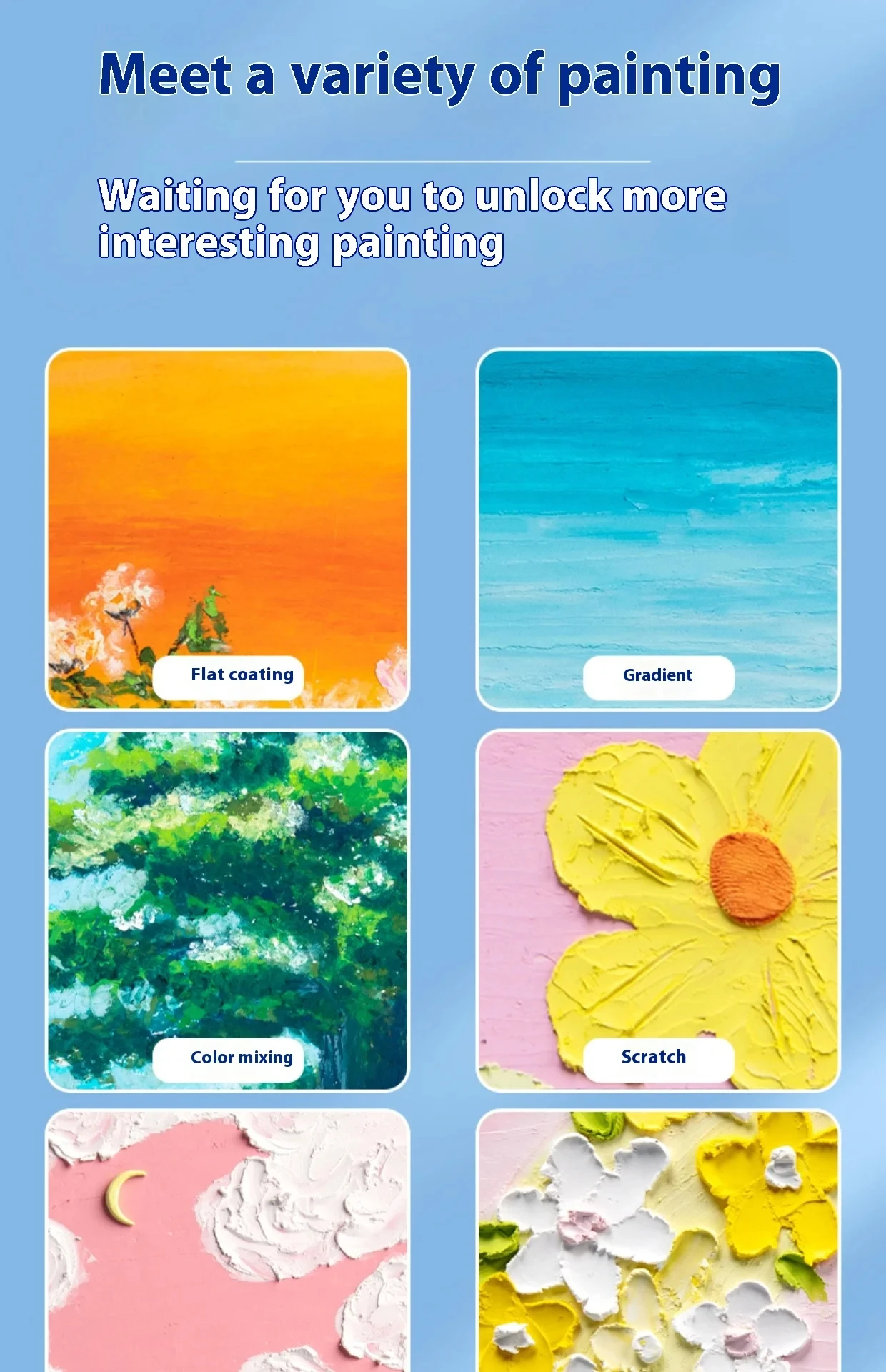Suitable for painting: Flat painting, mixing colors, stippling, overlaying colors, scraping, gradient.